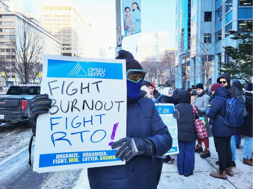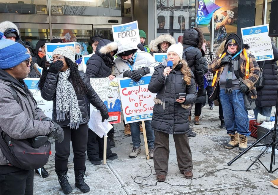 在一個極為寒冷的星期五早晨,OPSEU成員聚集在多倫多大學大道的安大略勞資關係委員會辦公室外舉行集會。不久之後,工會的一支團隊將進入內部,開始與政府調解,試圖對抗重返辦公室的強制令。